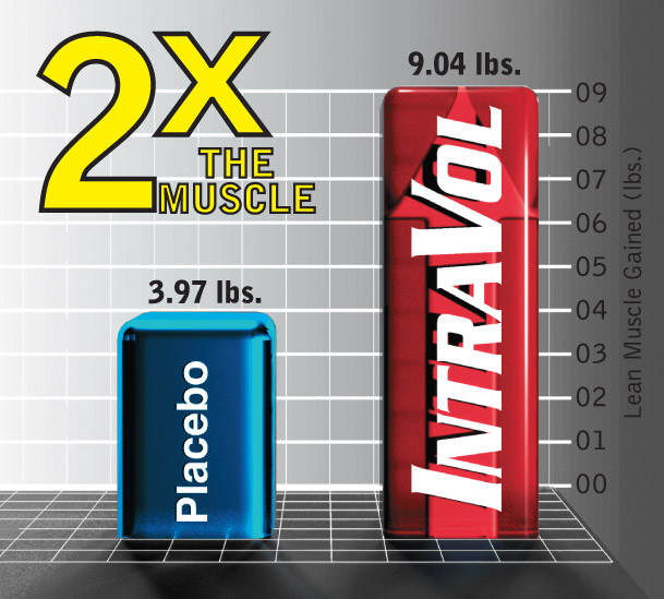 Итак, если мы говорим, что IntraVol способен увеличить спортивные достижения, то это нужно доказать. В лаборатории современной физической культуры Австралийского университета, было проведено исследование по измерению воздействия IntraVol на испытуемых во время тренировки. На протяжении 12 недель разделенные на 2 группы добровольцы принимали добавки с плацебо и компонентами IntraVol. Результаты были ошеломительными. По сравнению с контрольной группой, испытуемые, принимавшие IntraVol, увеличили мышечную массу на 127% больше. Кроме того на 39% был увеличен рабочий вес в жиме ногами, по сравнению с группой, принимавшей плацебо. Таким образом, было показано, что IntraVol действительно работает, помогая не только увеличить прирост мышечной массы, но и силы.